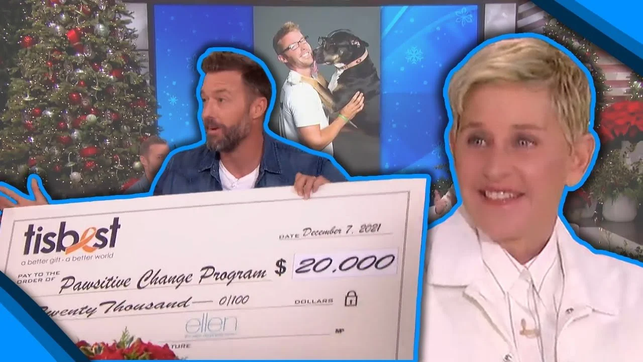“Ellen sat down with Zach Skow, who explained how his dogs helped him turn his life as an addict around to become one of helping others. He also discussed his Pawsitive Change Program, which gives incarcerated people a chance to co-own a shelter dog and learn dog-training skills. To help continue his mission, Ellen and her friends at TisBest surprised him with a check for $20K!”